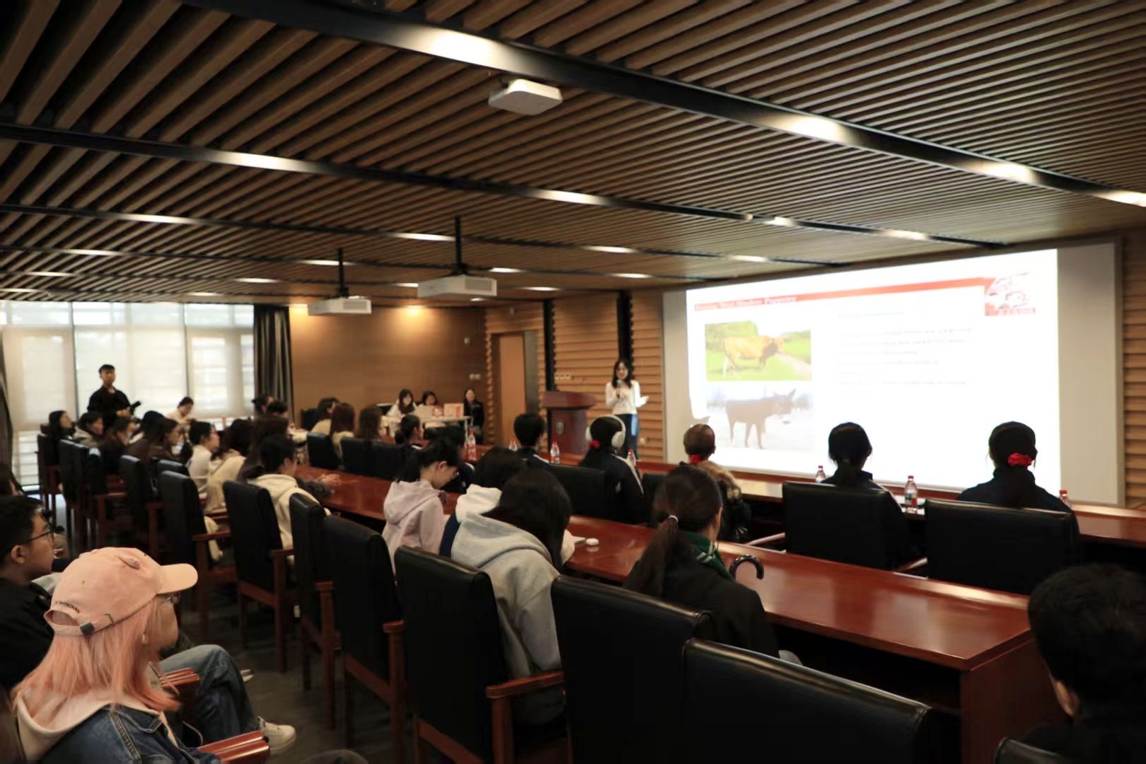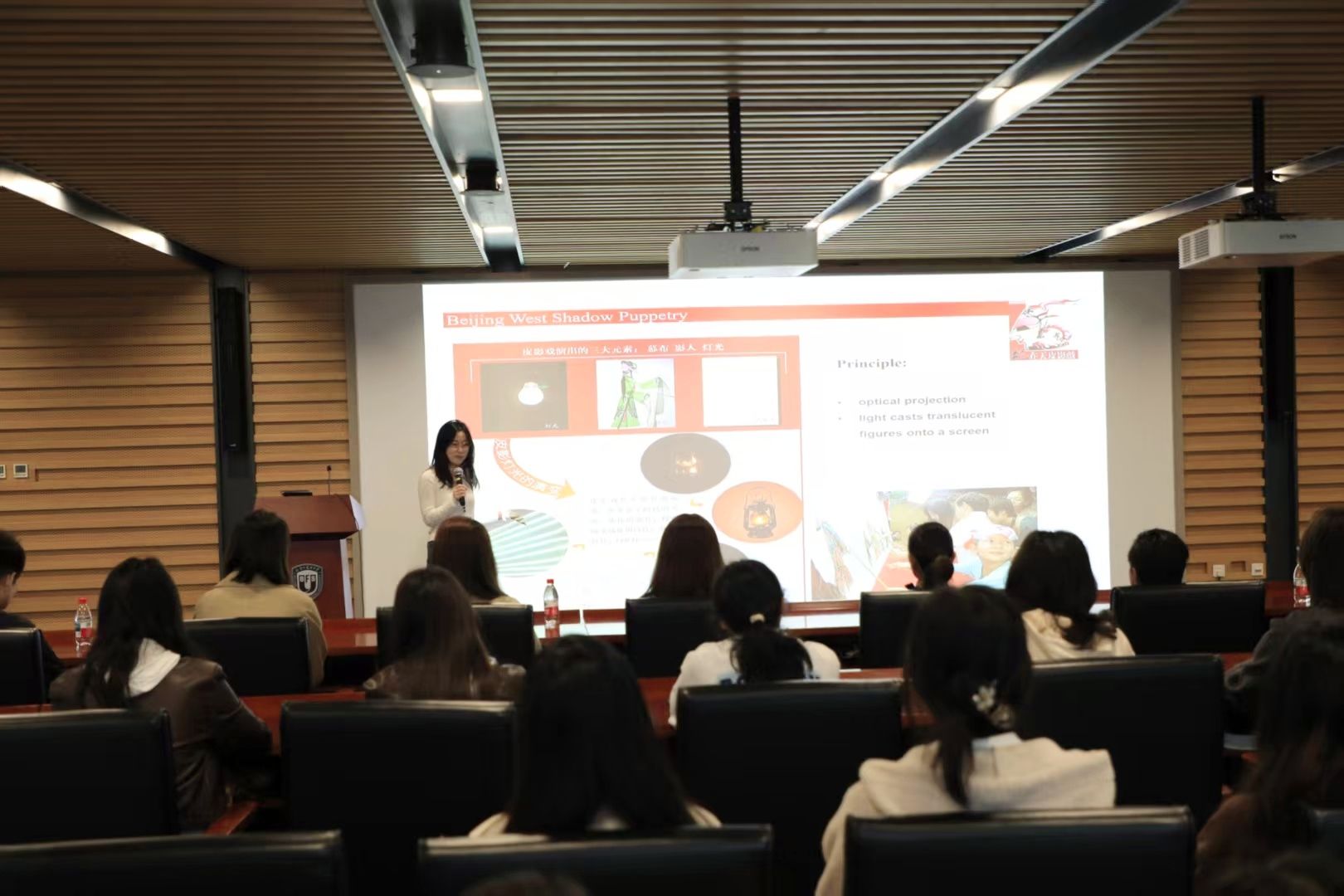 致辞,向远道而来的美国师生表示热烈欢迎,并介绍了皮影戏作为中国非物质文化遗产的历史价值与现实意义。随后韩子萌同学以流利的英文讲解了皮影的历史渊源与制作工艺,从选皮、雕刻到染色、定型,细致展现了皮影从原材料到艺术品的蜕变过程,彰显了学生党员在文化传播中的专业素养与使命担当。