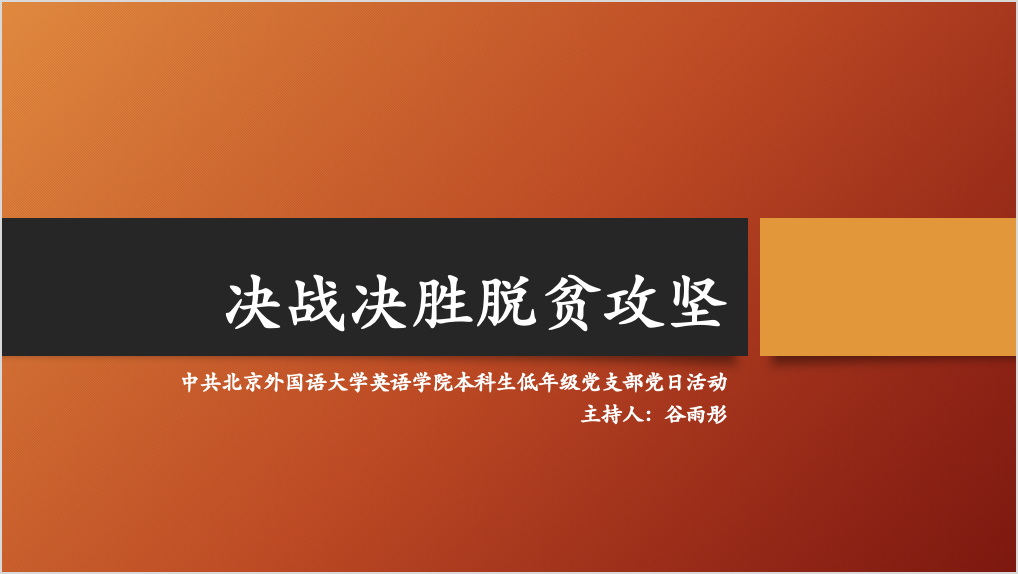 本次主题党日活动围绕今年3月6日习近平总书记在北京出席决战决胜脱贫攻坚座谈会上发表的讲话展开。这场在今年3月召开的会议在11月23日迎来了令人欣喜的结果,832个国家级贫困县已全部实现脱贫摘帽,全国脱贫攻坚目标任务已经完成。这项壮举离不开党各个机关政治忠诚、组织坚强、纪律严明、作风过硬的品质。谷雨彤同志首先对于习总书记在决战决胜脱贫攻坚座谈会发表的讲话进行了总结概述,随后结合自身经历和大家分享了她在学习该讲话后的感受。她总结了习总书记讲话中提到的我国脱贫攻坚取得的六个方面的成就,讲述了中国共产党带领人民实现“两不愁三保障”的追求背后的含义,总结了我国脱贫攻坚面对的困难与挑战,并指出了党的领导在决战决胜脱贫攻坚中的重要作用。