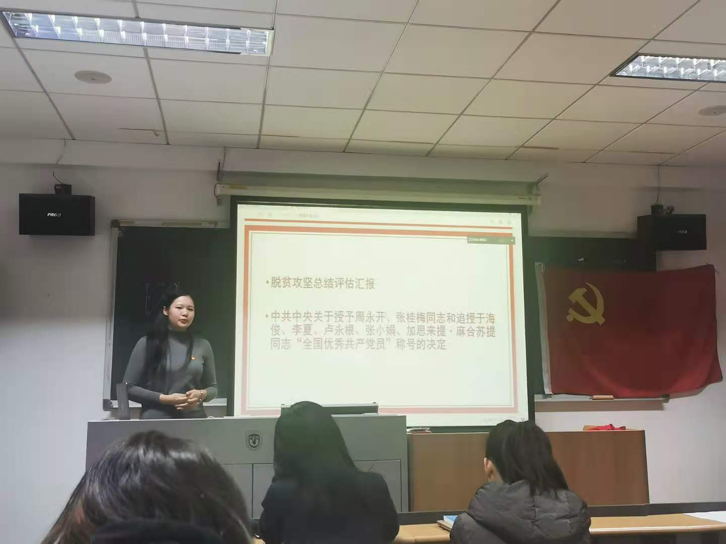 随后,大家一起学习了脱贫攻坚总结评估汇报以及中共中央关于授予周永开、张桂梅同志和追授于海俊、李夏、卢永根、张小娟、加思来提·麻合苏提同志“全国优秀共产党员”称号的决定。大家深刻体会到,扶贫不易,坚守基层不易,并向所有坚守在脱贫攻坚一线的党员干部们致以最崇高的敬意。全国优秀共产党员的感人事迹激励着大家,让大家感受到了信仰的力量。热米拉·塔依尔同志表示,从张桂梅校长的身上我们可以看到伟大的无私奉献精神,这种精神是中华民族时代精神和民族精神的体现。我们应该向她学习,将这种精神发扬光大,做有益于社会的事情。作为新时期的大学生,虽然不能像扶贫干部一样深入一线,但我们应当从自身做起,勤奋学习,做好自己的本职工作,为社会主义事业添砖加瓦。