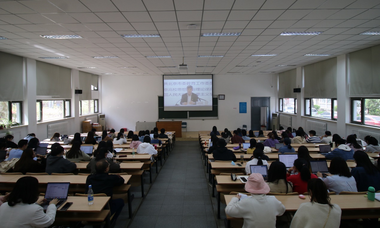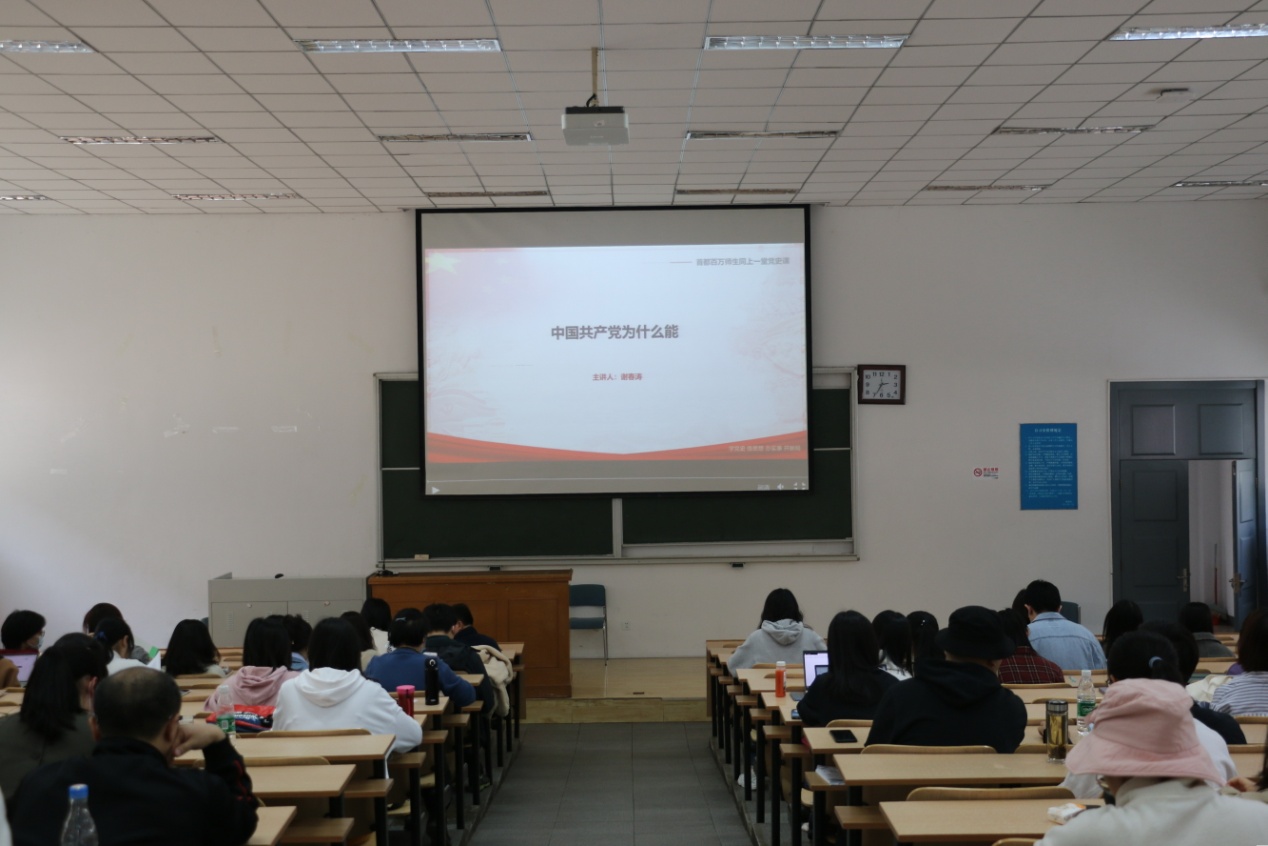 党总支于十二大教室组织本科生、研究生党支部党员、发展对象、积极分子,以及部分教职工党员观看“首都百万师生同上一堂党史课”网络公开课第一讲。