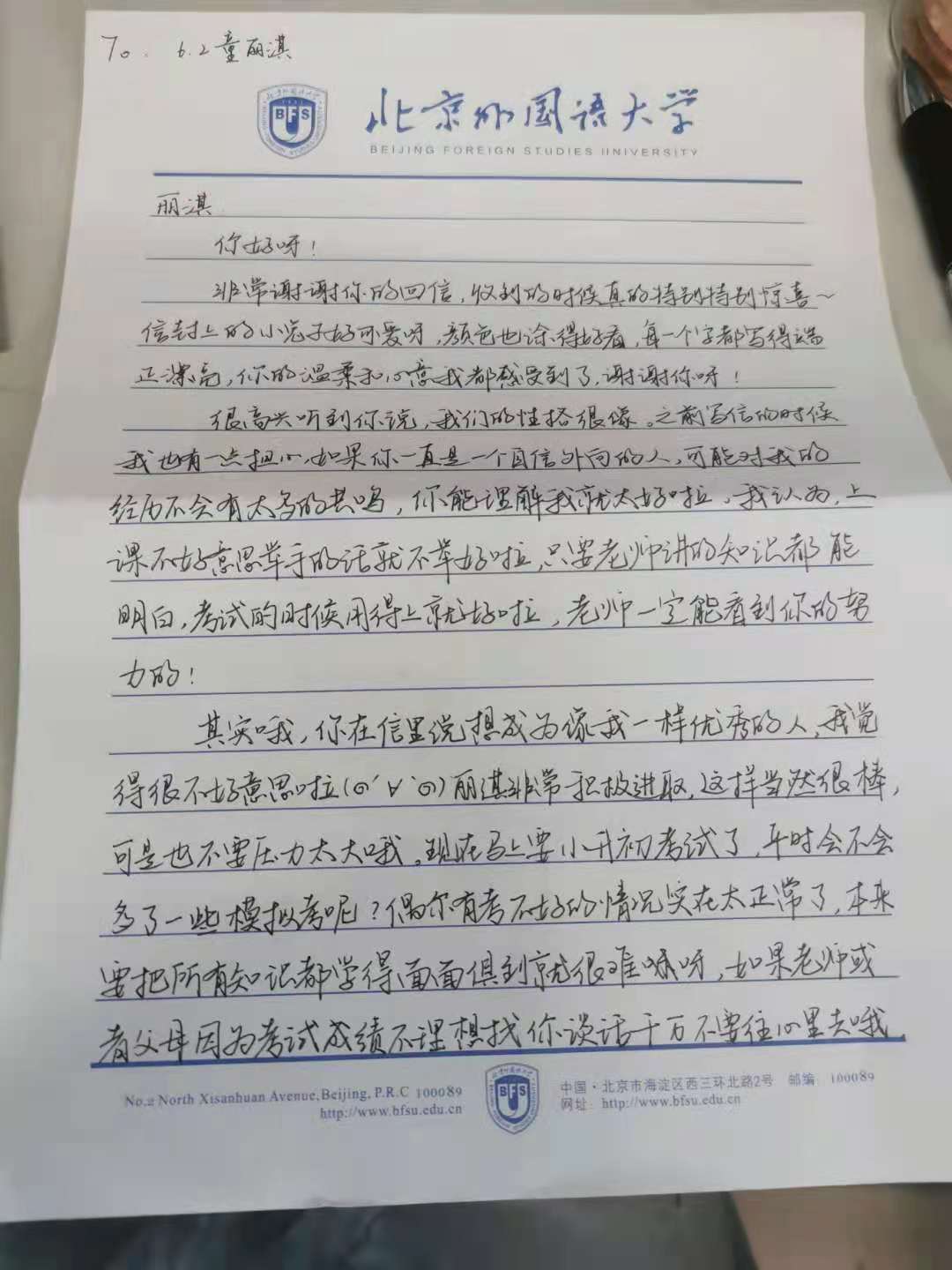本科生低年级党支部积极分子何蓉同志表示,自己非常开心能通过这次的活动认识可爱的丽淇小朋友。收到回信的时候真的很感动,因为没有想到一个六年级的孩子可以写出这样满满都是真诚的信,甚至还自己画了可爱的小信封,还能看到橡皮擦的痕迹,可以想象花了多少心思。希望丽淇小朋友可以快乐地长大,做最好的自己。