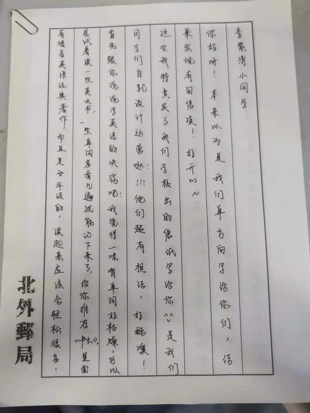 本科生低年级党支部党员于靖懿同志表示,两次给小朋友写信的活动我都有参与,感触颇深。这是第一次试图以一个大姐姐的口吻和小朋友交流。在写第一封信、选第一本书的时候,我特意上网寻找了五六年级的女孩会喜欢的话题,努力回想自己在这个年龄时的心态,对这两位女孩写下了真诚的问候和建议。当看到回信里对我的祝福的时候,我特别感动。我们虽然身隔几千公里,但因为这些纸上的文字而联系到了一起,一笔一墨能看到最真挚的感情。很感谢党支部的这次活动,让我和素未谋面的女孩有了联络,建立了深厚的友谊。