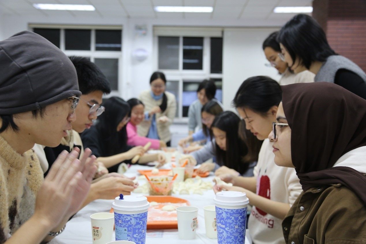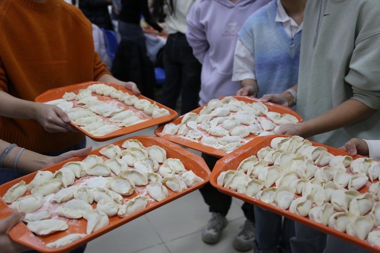 党总支书记殷悦老师的细心指导下,同学们一边包饺子,一边分享着各自家乡的过节习俗,现场其乐融融、笑语不断。大家齐心协力,分工明确:有的同学负责擀饺子皮,有的同学专注于包饺子,还有同学精心地将包好的饺子摆放整齐。不一会儿,一排排形态各异的饺子就呈现在眼前。
