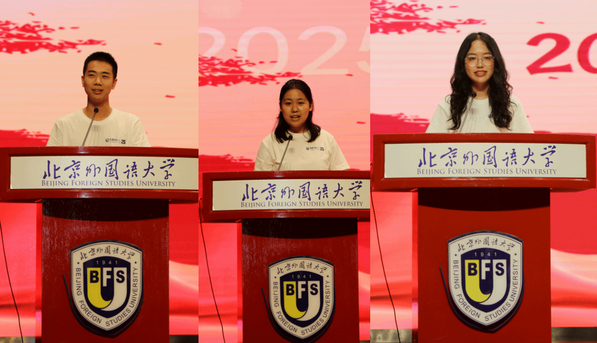 随后,2024级硕士研究生杨世阁同学作为老生代表发言,他与学弟学妹们分享了自己研究生支教团以及大阪世博会志愿者的宝贵经历,希望新生们在学术硬核、发展自由的北外英院大胆勇敢地去经历、去尝试,尽情地探索自己、丰富自己。2025级本科新生代表张梦芊同学则以北外英院的历史底蕴为引,分享了自己的三点愿景:家国之情、求真之心与担当之志。她期待与同学们一起,心怀国家、放眼世界,不断提升自己的专业能力与素养。2025级国际项目新生杨景行同学则认为,同学们不仅要注重“听说读写译”,更要把握不同文明背后的历史脉络、文化内涵与时代精神,也期待同学们在足球比分365