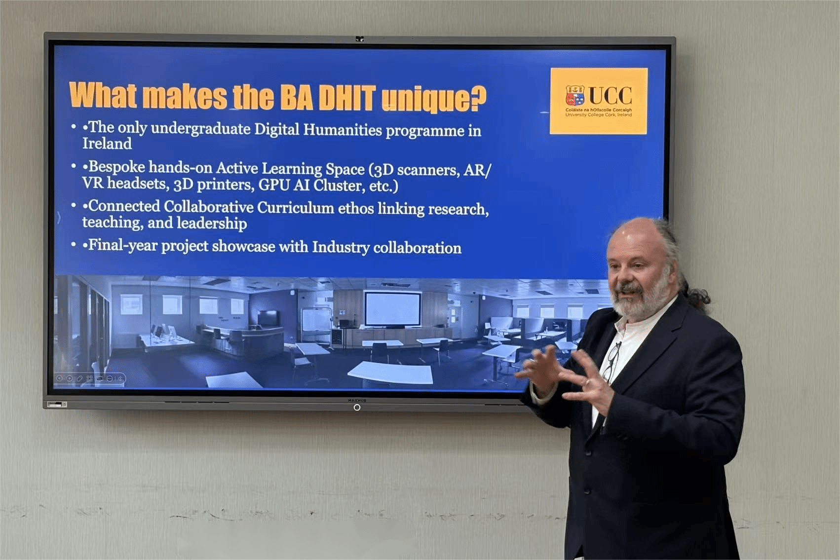 会后,墨菲面向北外师生举办了题为“数字人文在科克大学的发展”的专题讲座,系统介绍了科克大学数字人文在科研与教学中的跨学科实践,以及文化遗产、创意实践与新兴技术融合发展的相关成果。