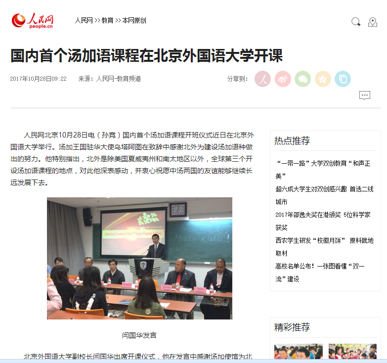 ——10月28日,我国人民网教育频道也刊登了报道:“国内首个汤加语课程在北京外国语大学开课”(//edu.people.com.cn/n1/2017/1028/c367001-29613725.html)。之后,其他国内重要新闻网站如搜狐和光明网等也相继转载了该条报道。