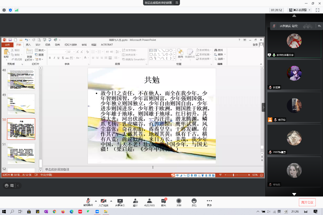 专业的学生不应只关注英文,更应体会母语中文的音、形、意的意蕴美,强调只有掌握好母语,才能助益我们的外语学习。讲座的最后,彭萍教授分享并朗读了梁启超先生的《少年中国说》和卢新宁女士的《北大中文系2012年毕业典礼致辞》,与同学们共勉。