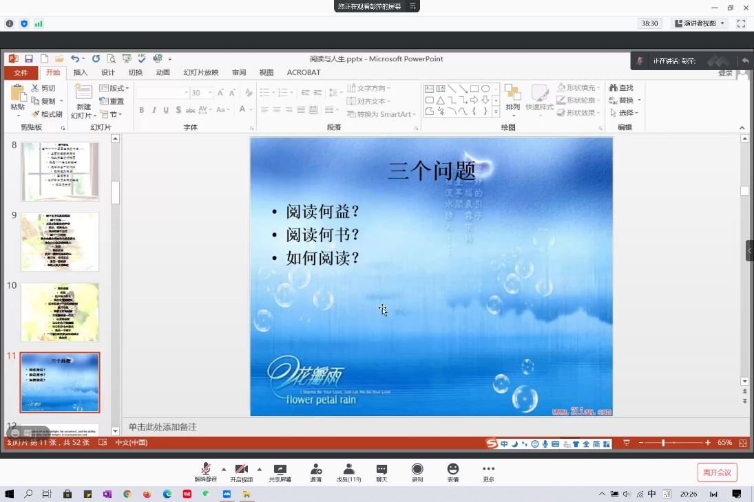 “阅读与人生”专题讲座最终圆满落下帷幕。通过此次讲座,同学们切实感受到阅读的乐趣,同时也掌握了有效的阅读方法,对阅读与人生的关系有了进一步的思考。红日初升,其道大光。作为新时代的青年,同学们应胸怀理想,脚踏实地,笃志虚心,循序渐进,用书籍指明人生的方向,用书籍搭建梦想的阶梯。