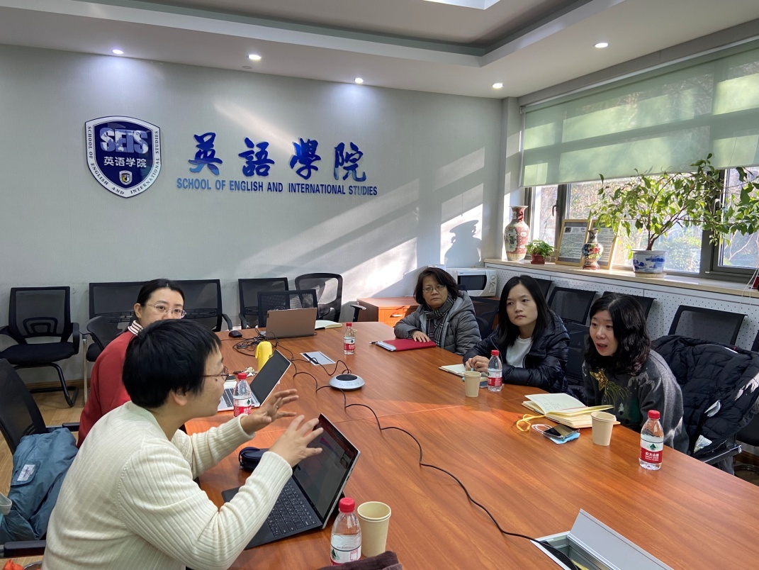 副院长张莲、2021年度三门待建课程负责教师及外研社制作团队全程参与推进会议。会上,参会课程负责人进行待建设课程的样课展示,外研社制作团队就样课展示给出专业意见,随后双方又就在线开放课程制作过程中脚本撰写、课程拍摄、后期制作及教学运行等方面进行问答和讨论。