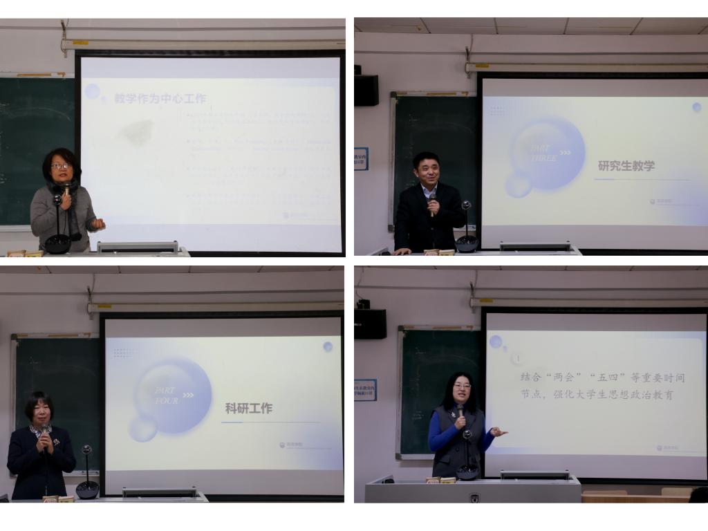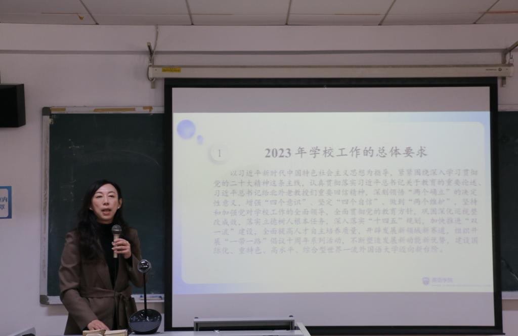 副院长张莲介绍了本科生课程开设及师资建设情况,并指出要在确保教学、管理、辅导、考试等日常工作顺利开展的基础上,着重做好国家一流本科专业建设、虚拟教研室建设、北外-人大21世纪马克思主义国际传播项目班建设、教学立项、常态化辅导以及教务管理等工作。副院长王展鹏从研究生招生宣传、导师制建设、课程思政、论文答辩以及育人模式等方面,提出要“扎根中国大地、对标世界一流”,全面提高研究生人才培养质量。副院长彭萍就新学期科研工作和对外合作工作进行了介绍。她鼓励教师积极申报国社科、教育部等各级各类科研项目。提出要规范各类讲座、研讨会、学术沙龙的申报、审批、管理和检查工作。在对外合作中,要做好师生出国出境交流学习的安全保障工作,不断推进2023年高端引智以及与国外大学合作项目。党总支副书记孟庆琨汇报了本学期学生工作的重点。一是结合“两会”“五四”等重要时间节点,加强大学生思政教育。二是全力做好2023届毕业生就业保障工作。三是积极开展心理问题及困难学生帮扶工作。四是依托足球比分365