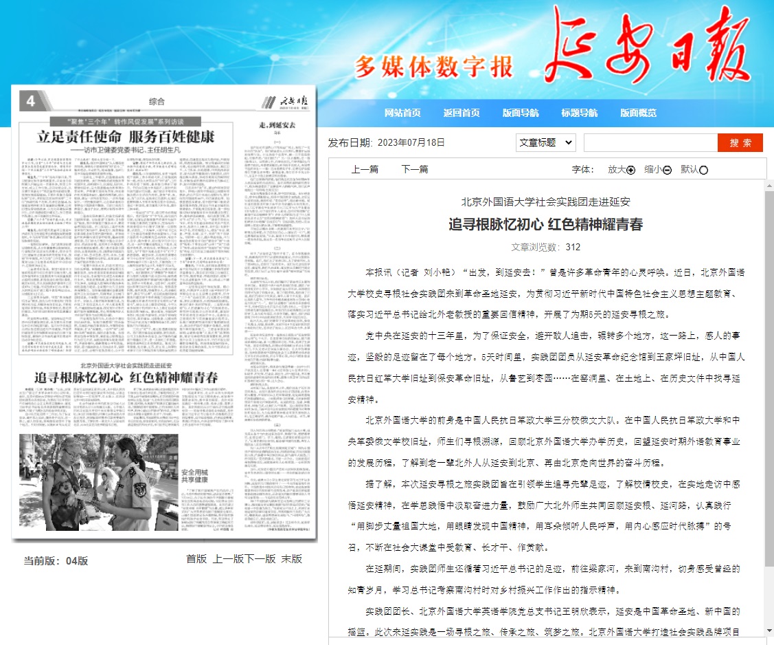 7月6日《延安日报》刊登题为《北京外国语大学社会实践团走进延安 追寻根脉忆初心 红色精神耀青春》,报道北京外国语大学校史寻根实践团前往延安开展实地调研活动。