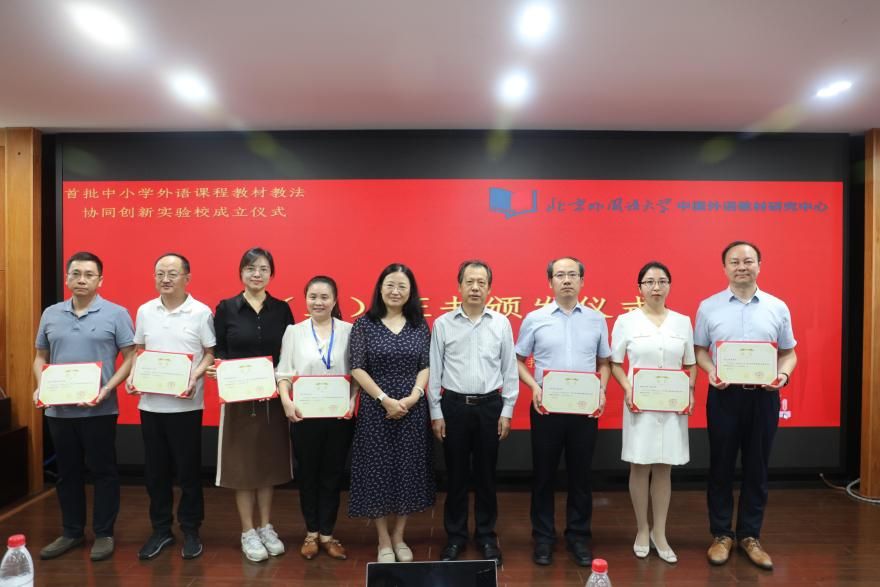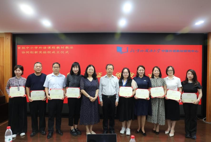 北京外国语大学中国外语教材研究中心副主任杨鲁新随后宣布了首批中小学外语课程教材教法协同创新实验校名单;孙有中教授为实验校代表一一颁发证书。实验校覆盖全国10个省或直辖市,由19所优质中小学构成。