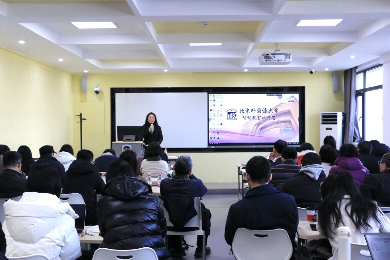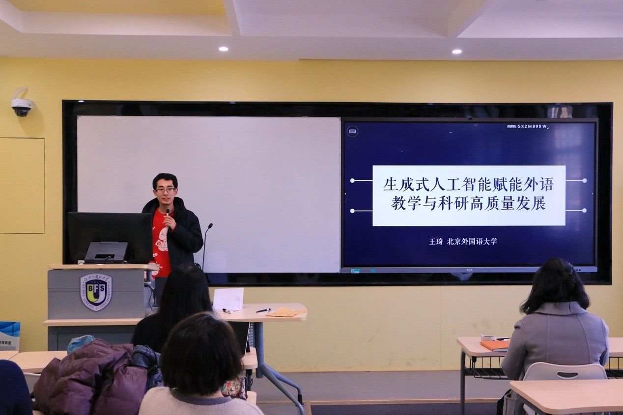 北外人工智能与人类语言重点实验室王琦博士以“生成式人工智能赋能外语教学与科研高质量发展”为题,作发言报告。从生成式人工智能入手,讲述了大语言模型的发展变革。提出传统外语教学面临一定的问题与挑战,人工智能能够在很大程度上赋能外语教学与研究,并通过演示范例生动形象地讲解了如何通过人工智能辅助教学、优化教学。