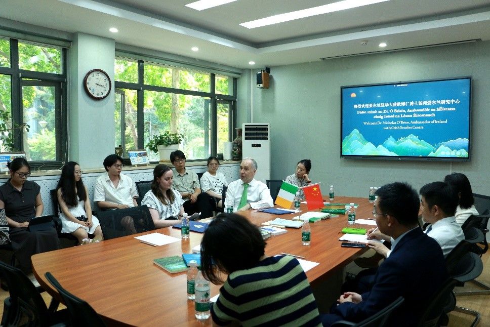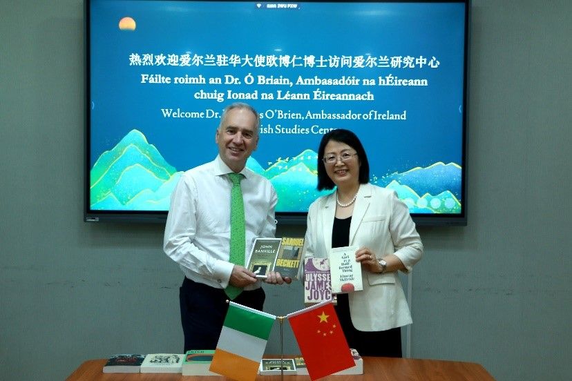 爱尔兰研究中心,并与师生互动交流。爱尔兰研究中心师生就中爱文化互动、爱尔兰文学在中国的发展、爱尔兰音乐相关项目参与、高校联动暑期项目、爱尔兰语资源支持等问题进行了沟通交流。欧博仁高度肯定了爱尔兰研究中心师生的工作成果,认为在各方努力下,未来中爱交流和学术沟通前景开阔,值得期许。最后,欧博仁赠予爱尔兰研究中心一批书籍,助力中心发展。