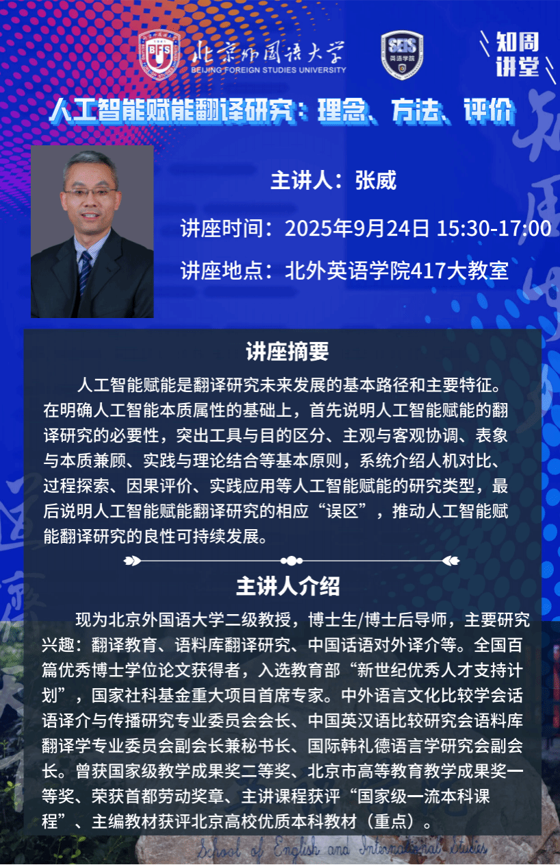 现为北京外国语大学二级教授,博士生/博士后导师,主要研究兴趣:翻译教育、语料库翻译研究、中国话语对外译介等。全国百篇优秀博士学位论文获得者,入选教育部“新世纪优秀人才支持计划”,国家社科基金重大项目首席专家。中外语言文化比较学会话语译介与传播研究专业委员会会长、中国英汉语比较研究会语料库翻译学专业委员会副会长兼秘书长、国际韩礼德语言学研究会副会长。曾获国家级教学成果奖二等奖、北京市高等教育教学成果奖一等奖、荣获首都劳动奖章、主讲课程获评“国家级一流本科课程”、主编教材获评北京高校优质本科教材(重点)。