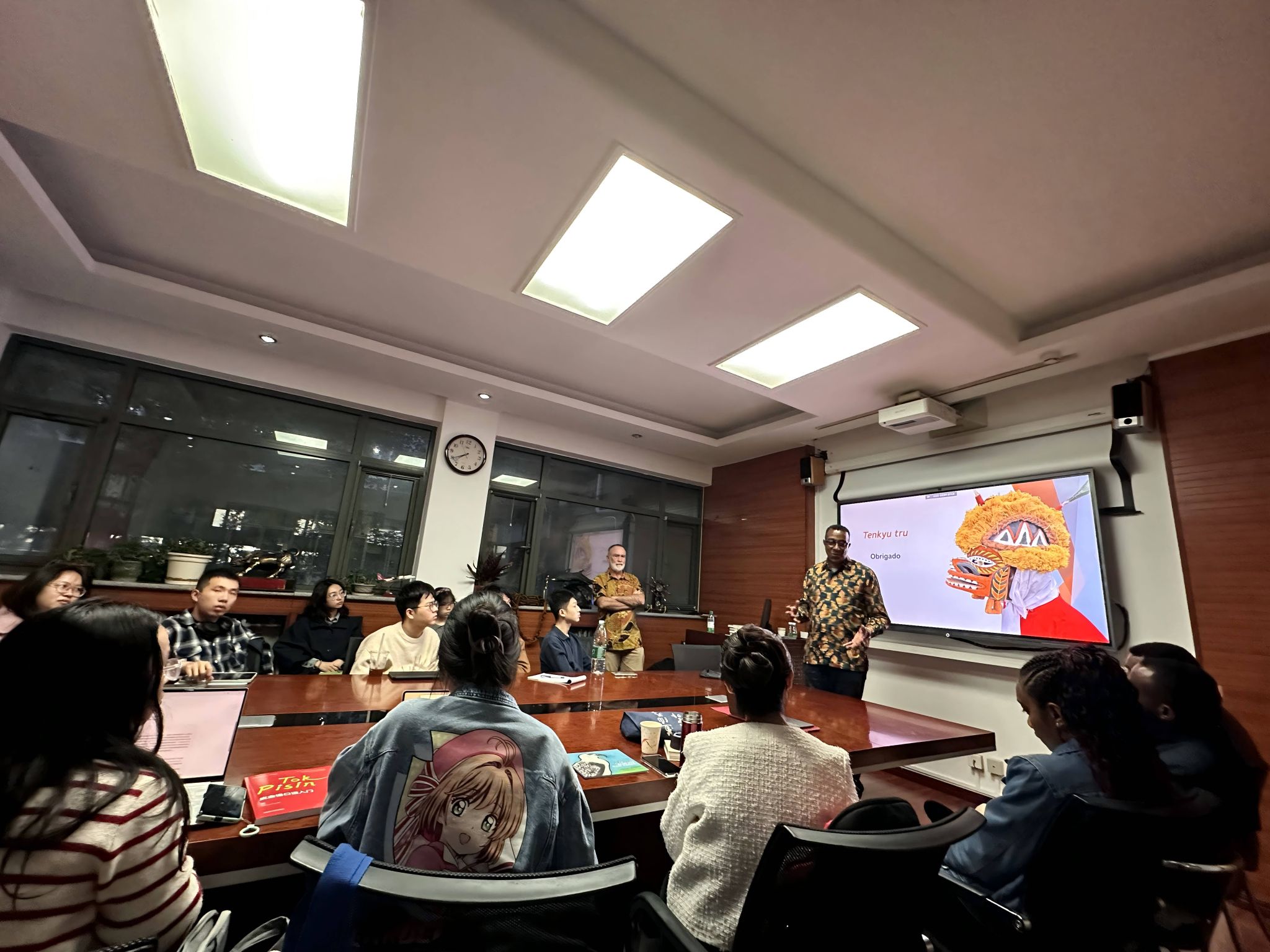 沃克教授自1979年起便在巴布亚新几内亚进行研究。他首先为大家详细介绍了该地区丰富的语言与文化资源,强调了全球部分语言和文化的濒危状况。他指出,巴布亚新几内亚是世界上语言最多样化的地区之一,拥有超过820种语言,正因为这些语言和文化的多样性,进行民族志研究并记录下这些文化遗产显得尤为重要。接下来,达希尔瓦博士生分享了他与新爱尔兰岛的纳里克部族(Nalik)合作开展的项目。作为一位生物学背景的研究者,他结合部族的传统生物知识,通过参与式研究法中的行动研究方法(action research),和沃克教授及当地学生共同创作了一本记录部落文化与自然联系的书籍《“鸟”:鸟与纳里克文化(A Maani: Birds and Nalik Culture)》,该书后来成为纳里克当地学校的教材之一,为来自其他地区的学校教师提供了更贴近当地文化的教学素材,将原住民社区知识带回学校课堂。达希尔瓦将样书提供给在座师生阅读,他认为,这种 “自下而上”通过社区自身力量发掘与传承文化的方式提升了当地人的参与感和话语权,能真正实现文化传承。沃克教授也提到,北外的学生可以结合民族志田野调查,将自己的语言能力和人文视野应用于更广泛的研究中,以帮助记录和保护全球濒危的语言与文化。