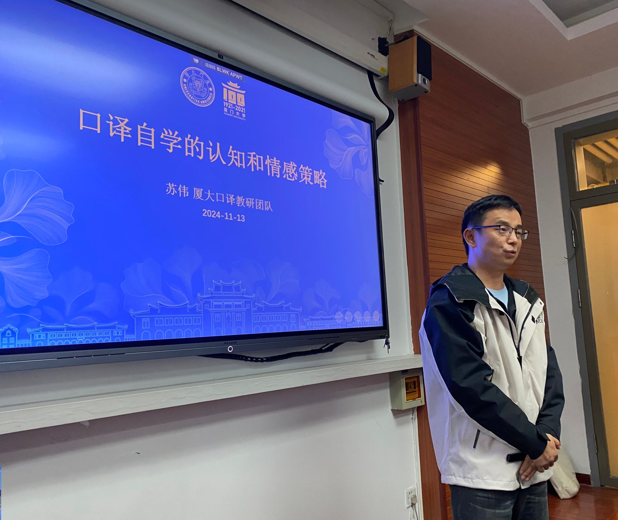 在讲座的下半场,苏教授探讨了口译的情感策略,分析了口译员性格与口译学习的关系,并强调了心理素质与情感策略在口译中的关键作用。整场讲座内容层层深入,逻辑严谨,师生们聚精会神,反响热烈,进一步坚定了口译学习的信心。