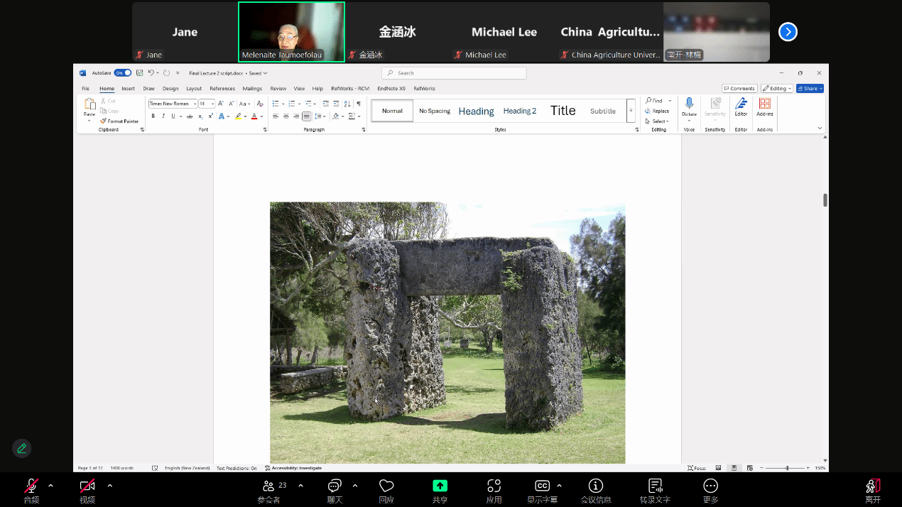 塔乌莫艾富拉乌博士首先对汤加语单词mātanga进行了简要介绍,由此引出讲座的主题——汤加景点背后的传说。汤加是南太平洋地区的一个岛国,有着众多美丽的风景,在这些美景的背后往往蕴含着丰富的历史文化含义。接下来,塔乌莫艾富拉乌博士选取了非常有代表性的两个景点——三石门(Ha‘amonga Trilithon)和倚靠的岩石(Maka Fākinanga)——进行了详细的讲解。在介绍的过程中,塔乌莫艾富拉乌博士结合景点图片,将景点背后的神话传说、历史故事、文化含义等娓娓道来,引人入胜。