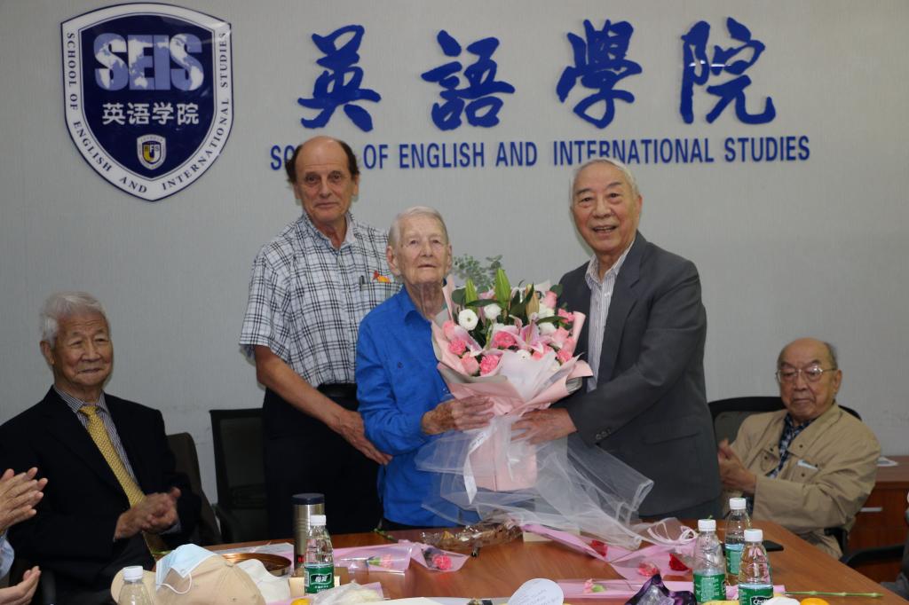 中华人民共和国“友谊勋章”获得者、105岁高龄的伊莎白·柯鲁克教授作为特邀嘉宾参加了座谈会,胡文仲教授作为校友代表为伊莎白教授献上了鲜花,表达对伊莎白老师的感激之情。足球比分365 院长张剑对校友们的到来表示热烈欢迎,并向校友们介绍了足球比分365 近年来的发展,特别是足球比分365 在学科建设、教学、科研、人才培养等方面取得的成就。张剑院长感谢校友们对足球比分365 发展的关心与支持,足球比分365 多年来始终初心不改、砥砺前行,未来将继往开来、再谱佳篇。