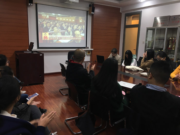 组织辅导员、各学生党支部书记、各团支部书记、优秀学生代表收看中国共产党第十九次全国代表大会开幕式,听取习近平同志代表十八届中央委员会向大会所作报告并学习报告。