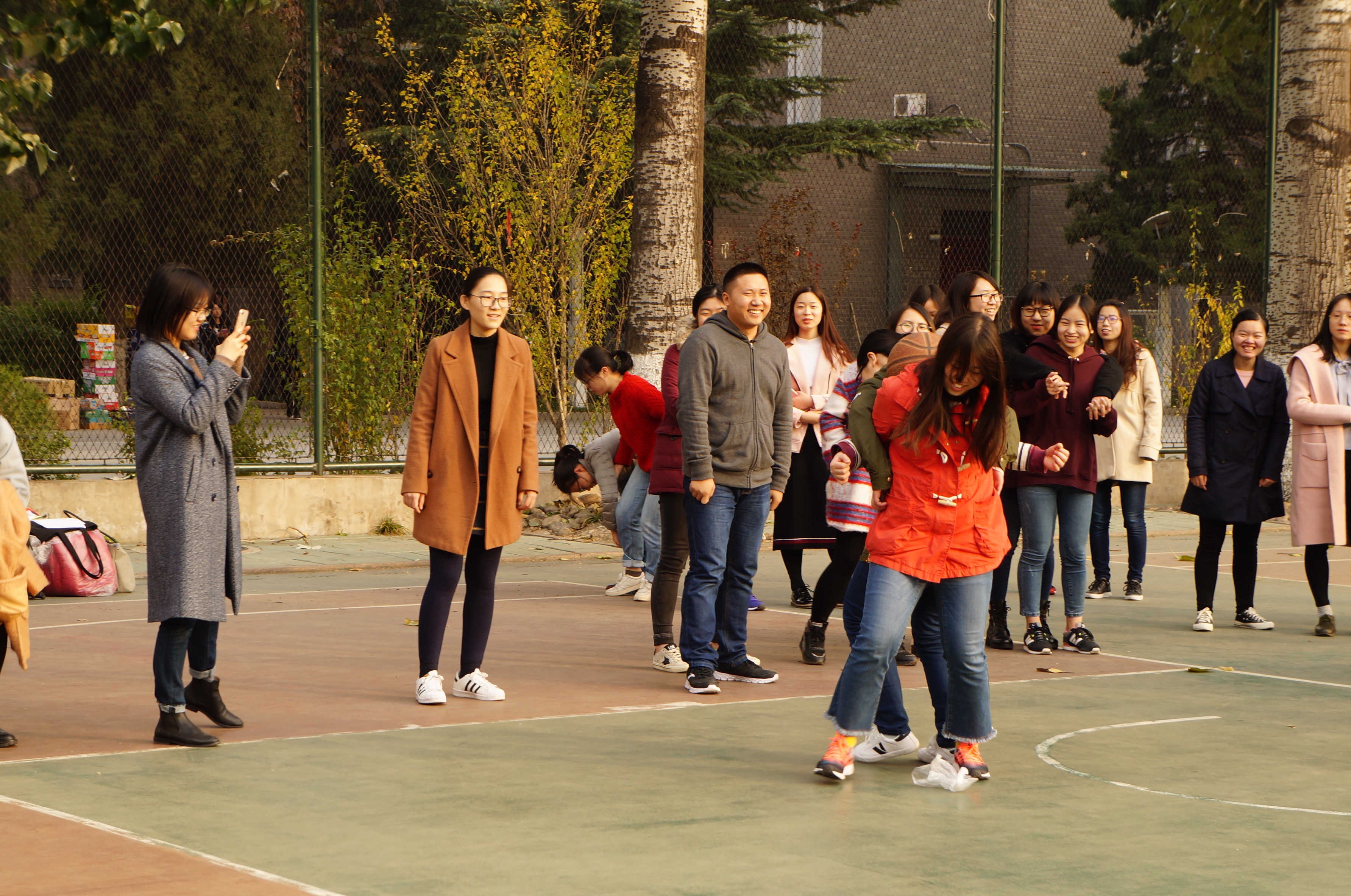 ——本次趣味运动会采用临时分组的团体赛形式,由研一笔译1班、笔译2班、语言学、爱研、英研、美研、澳研及研二的同学组成四支队伍参赛。“花样接力”活动中,同学两两搭配,协作完成背对背运篮球、两人三足,运球跑游戏。同学们由开始的生涩,逐渐磨合成默契的搭档,团队协作,屡创佳绩。