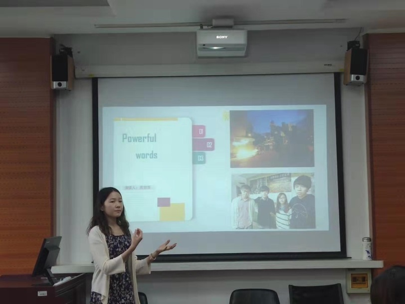 周羽西同学结合自身经历,讲述了自己对于新时期爱国主义的独特理解;高玉洁同学通过结合自己的切实经历,表达了自己对祖国深深的热爱;周逸仙同学以扶贫为主题,展示了中国如何将一个个孤岛连成大陆;王新园同学以“我们应该记得什么”的问题开头,表达了铭记历史、铭记英雄的主题;李汶蓉同学结合自己做志愿者的经历,告诉了我们“奋斗的青春最美丽”;翟姊祺同学结合翻译专业的发展史,提出了对自己的期望,希望自己今后能够在翻译事业中贡献出自己的力量。