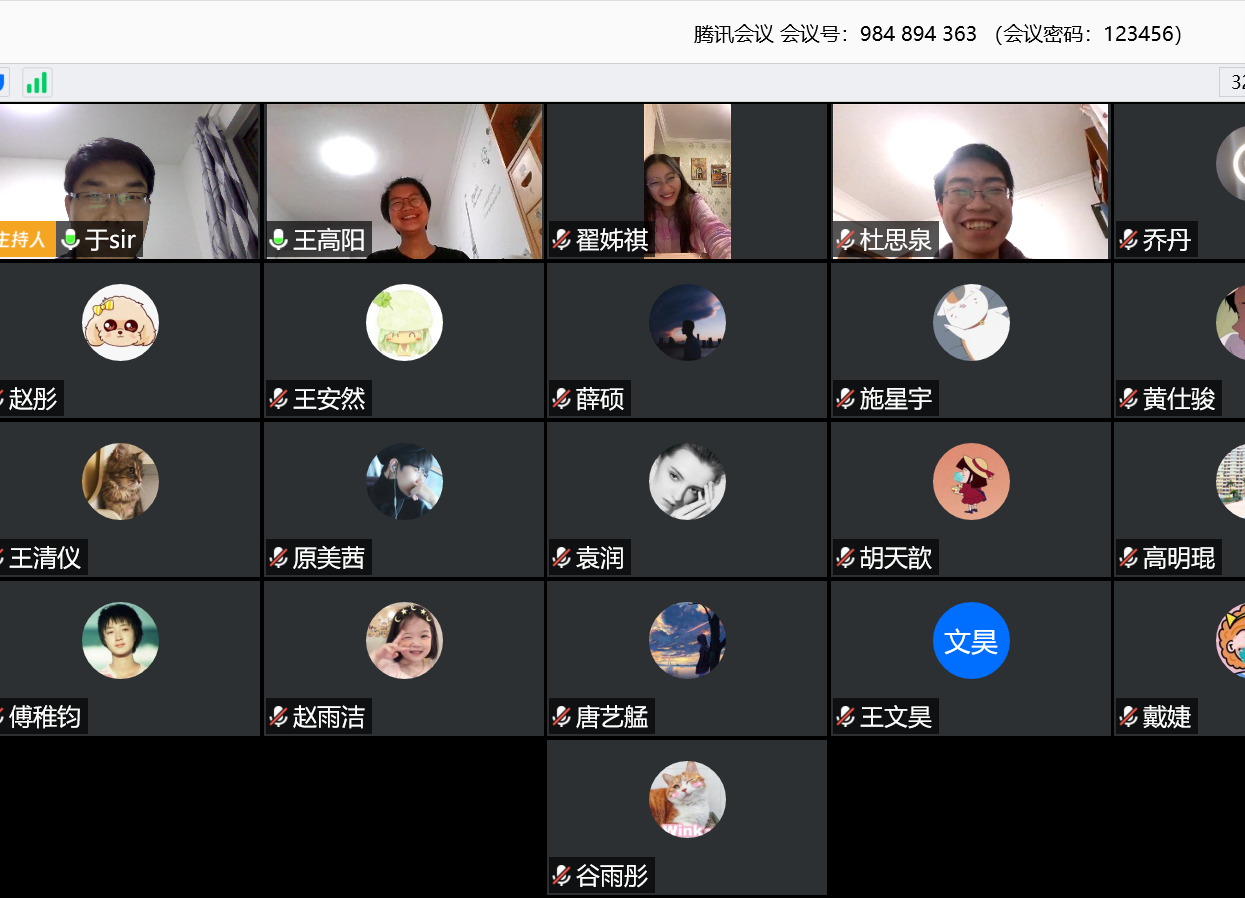 随后,于老师着重布置落实两项具体工作。第一,《关于进行2020年度“大学生创新创业训练计划”项目申报的通知》。结合前段时间足球比分365 下发的通知要求以及同学们提出的相关问题,作进一步的解释说明:一是在提交材料之前,要确保与指导教师就相关选题进行全面深入的研究,提高申报成功率。同时也尽量减少因选题不适导致后期难以继续开展的情况。二是严格按照学校规定时间提交电子版材料。第二,落实《北京外国语大学“青春班级,抗疫有你”班集体建设活动暨2020年北外十佳班集体评选活动》的通知要求。希望各个班级广泛动员、集思广益,结合疫情期间所见所闻,开展积极向上、具有正能量的线上活动,体现班级特色。