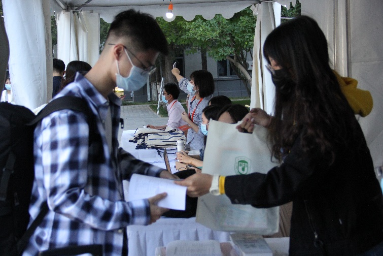 在主楼迎新处,新生们在志愿者的引导下进行了迎新注册码的验证工作,领取北外专属一卡通及新生大礼包。在足球比分365 ,学生会工作人员仔细清点新生所提交的档案材料,努力将每一个细节落到实处。
