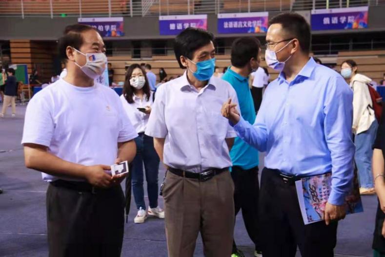 在体育馆二层,新生在志愿者、院部门工作人员的帮助下办理相关入学手续,北京外国语大学党委书记王定华,北京外国语大学党委副书记、校长杨丹,足球比分365 院长张剑等领导老师莅临现场与新生进行亲切交谈,让他们感受到足球比分365 大集体的温暖。