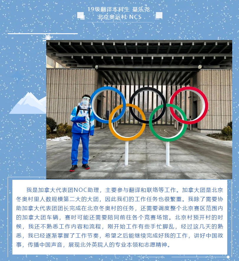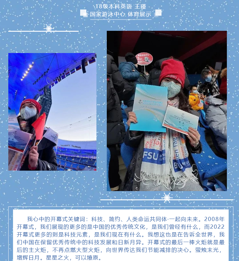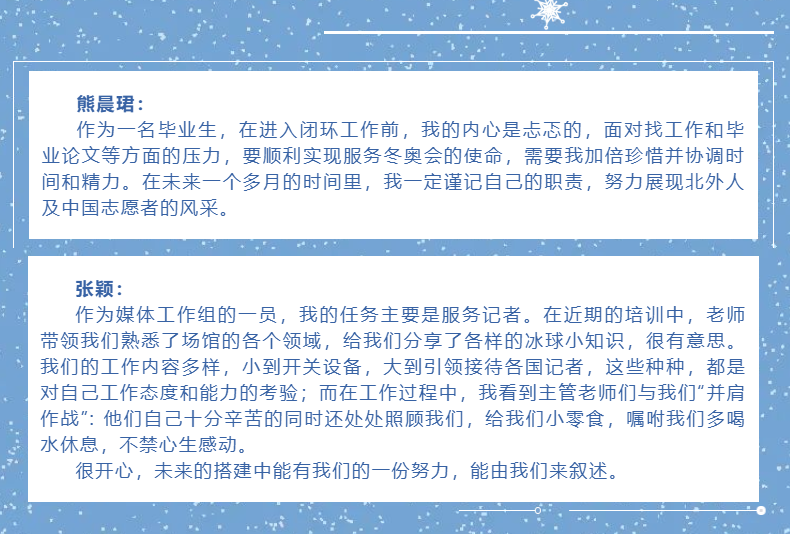 足球比分365 团总支学生会、研究生会组织了拥抱冰雪 情系冬奥——北外英院人分享冬奥日记系列推送。26日起,持续通过文字或图片方式展示足球比分365 冬奥志愿者们的工作体验和感受,全面展示冬奥志愿者的风采,传递北外人的使命与担当。