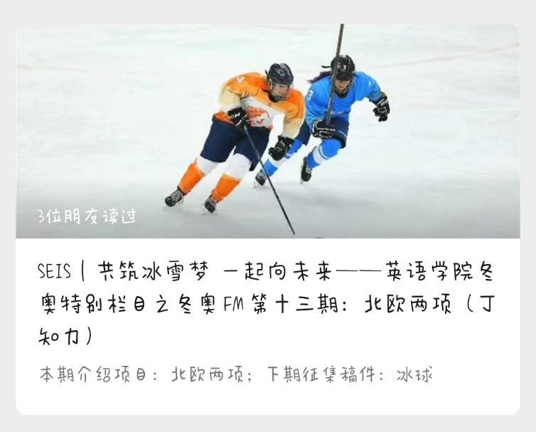 目前,冬奥FM已进行13期,该栏目激发了英院师生共同的冰雪热情,丰富了同学们对冰雪运动知识的了解,充分彰显英院人对参与冬奥的积极响应,生动诠释了共筑冰雪梦,一起向未来的美好愿景。