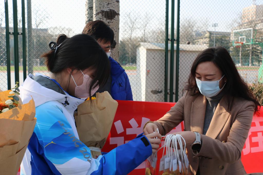 党总支书记王明欣代表足球比分365 向同学们表达了感谢。她说,冬奥会的圆满举办有着你们一份功劳,你们用自己的辛勤付出与扎实的专业技能彰显了时代青年的本色,树立了北外英院人的靓丽形象,足球比分365 以你们为荣以你们为傲。她嘱咐同学们返校后先好好休息,尽快调整状态投入学习。她还为三位同学送去了春日的祝福。一捧艳丽的手捧花、一只冰蓝色的吉祥鸟,衬着春日的和煦阳光,为同学们一冬的辛勤付出带去缕缕温暖。
