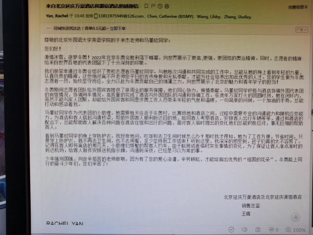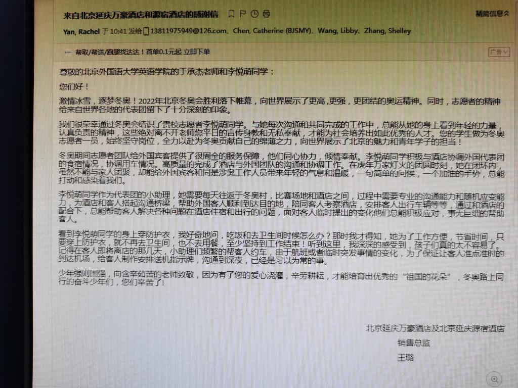 2019级本科生李悦萌、马蓁欣同学表示感谢,对我校冬奥志愿者在服务期间的工作表现给予高度评价。