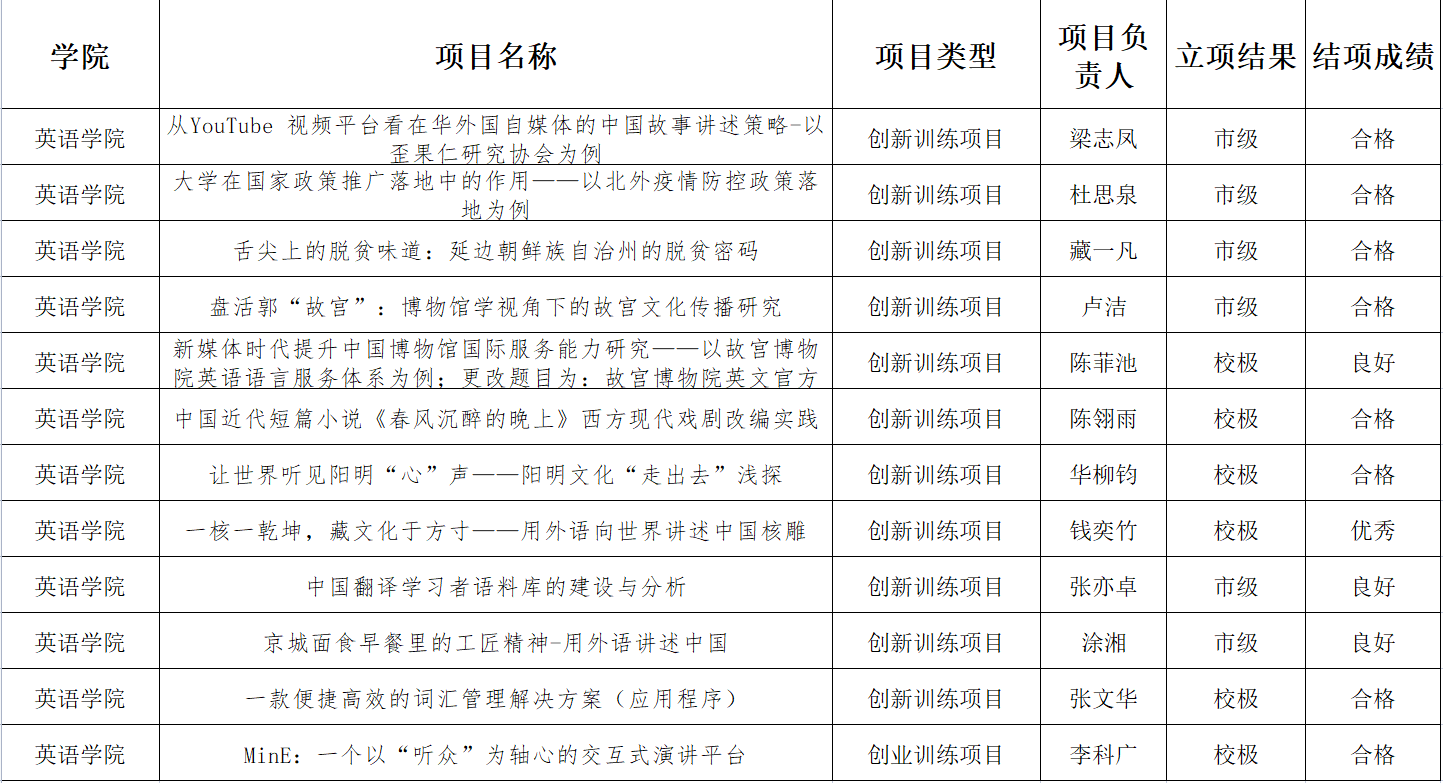 大学生创新创业训练计划共计12个项目结项,其中1个项目获评为优秀项目、3个项目获评为良好项目。