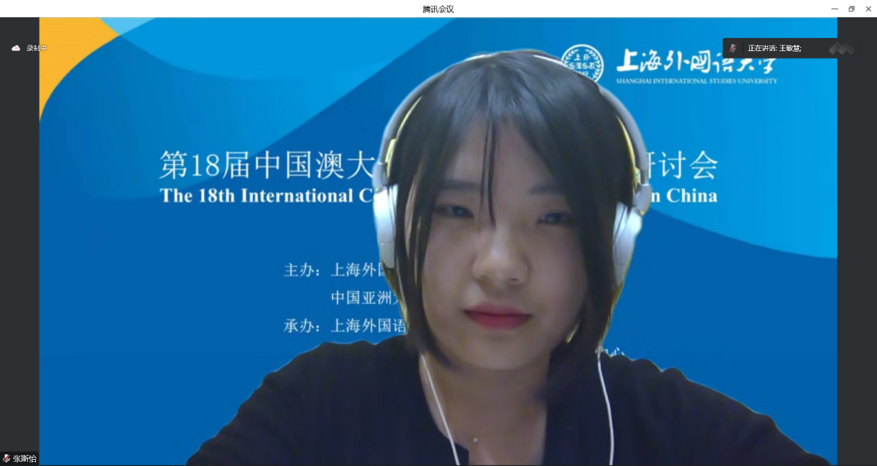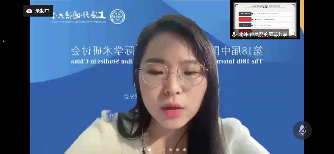 在小组发言环节,8名研究生分别就中澳关系、澳大利亚文学、语言、社会与文化等话题进行发言。伊美丽以An Analysis of the “Chinese Threat Theory” in Australia from the Perspective of Media and Public Opinion Since 2017为题,从媒体的角度深入分析了澳大利亚自2017年来对华政策的经济和社会根源;李影以The Adjustment of Australian Foreign Policy Towards China—An Analysis of Turnbull government (2017-2018) from the Neoclassical Realist Theory为题,运用新古典现实主义理论分析了2017年特恩布尔政府对华政策转变的原因,指出中国崛起和美国对中国的敌意态度这两个体系结构是引起澳外交政策改变的自变量,而领导人意向和战略文化两个国内结构是中介变量,自变量通过中介变量影响澳大利亚对华政策;管容以A Study of the Securitization of Chinese FDI in Australia: A Case Study of the Lease of the Darwin Port为题,研究了达尔文港租约在澳大利亚国内引发国家安全担忧的原因,指出澳大利亚国内各方通过安全化言语行为将达尔文港租约建构成对澳大利亚国家安全的威胁。