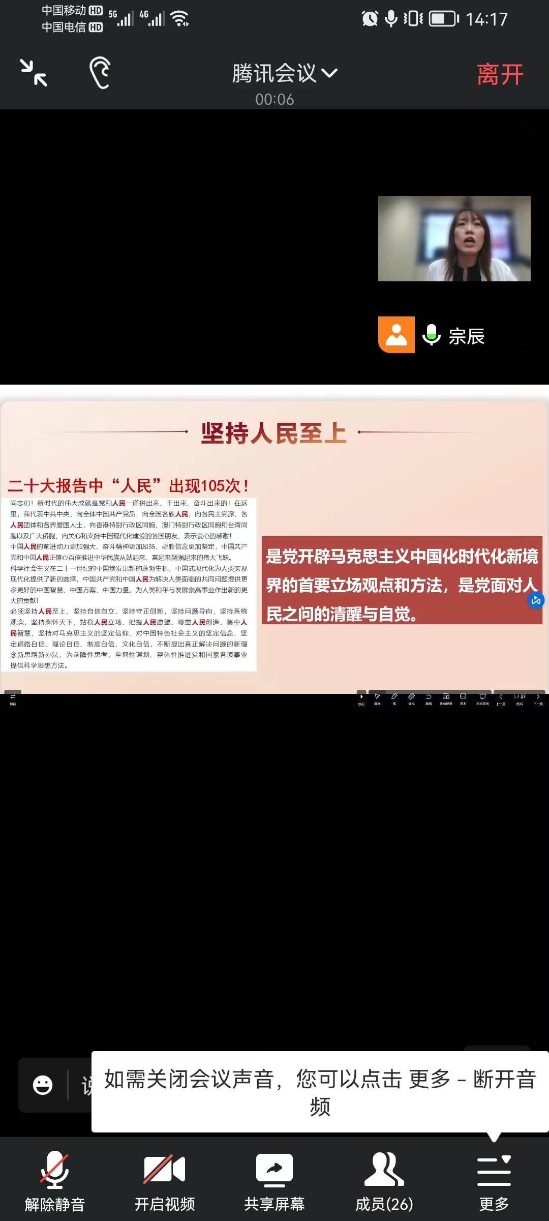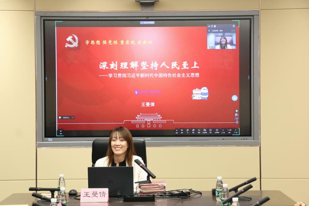 副院长王曼倩副教授受邀作为领读专家,以“深刻理解必须坚持人民至上”为主题讲述专题党课。王曼倩围绕党的二十大报告,从理论、历史、成果三个逻辑层次,深入浅出地讲述了中国共产党坚持人民至上思想的发展脉络和重大成就。她指出坚持人民至上是党开辟马克思主义中国化时代化新境界的首要立场观点和方法,是党面对人民之问的清醒与自觉。她聚焦“马克思主义的本质要求”、“党百年奋斗的初心使命”、“新时代巨大成就的力量之源”、“全面建设社会主义现代化国家的最大底气”四个方面,深刻阐释了什么是人民至上,为什么坚持人民至上以及如何坚持人民至上。
