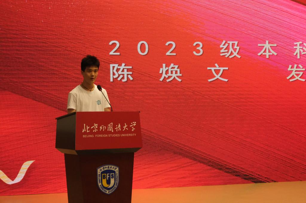 2021级本科生刘辰阳同学作为老生代表发言,与同学们分享了自己在北外的学习经历,鼓励大家踊跃探索个人兴趣方向,丰富知识体系,提升自身学术能力。2023级本科生新生代表陈焕文同学表达了自己对北外的向往、圆梦的喜悦以及奋斗的决心,在未来的学习生活中,他希望和大家一起以“北外人”、“英院人”的身份,奔走在“为人民服务”的第一线,一同开启人生的新阶段。2023级硕士生新生代表王安然同学提出,要学会学海无涯“乐”作舟,利用好英院所提供的丰富资源,向老师虚心求教,与同学学习研讨,成为有家国情怀、有全球视野、有专业本领的多语种复合型人才。