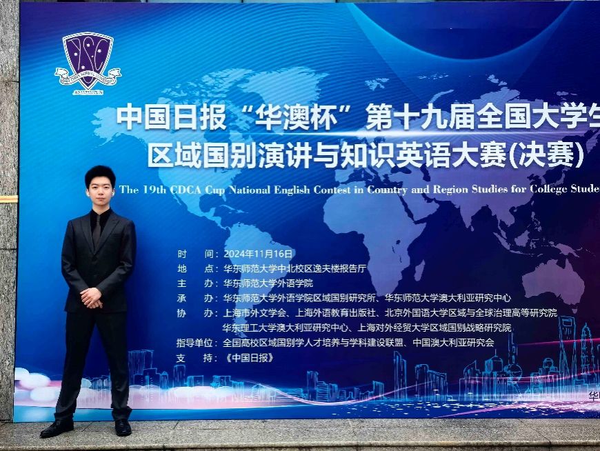 竞赛,《中国日报》、《21世纪英文报》、《新民晚报》等多家主流媒体对本赛事进行报道,在国内外享有较高的知名度和影响力。本届大赛主题为“China in the World”。比赛中,来自北京外国语大学、上海交通大学、复旦大学、华东师范大学、上海外国语大学、上海对外经贸大学等高校的16名选手围绕“世界中的中国”这一主题,展现了独到且深刻的见解。经过已备演讲、即兴演讲和区域国别知识问答三个环节的比拼,黄启恒得到评委和观众的一致认可,最终荣获特等奖(亚军)。