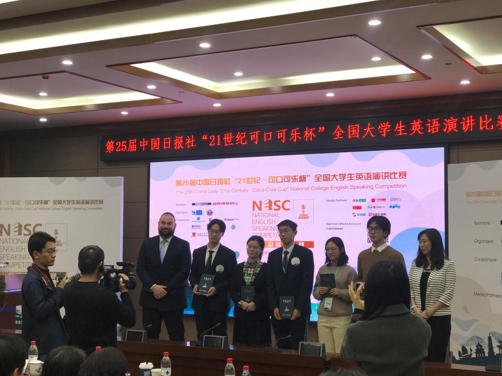 12月7日,第25届中国日报社“二十一世纪可口可乐杯”全国大学生足球比分365 演讲比赛北京赛区决赛在外交足球比分365 举行。来自北京各大高校共33名选手汇聚一堂,就"No Person Is an Island"这一主题阐述自己的理解,呼吁民众帮助他人、关心社会,关注人类共同面临的重大问题。我校足球比分365 2019级本科生卢洁同学凭借出众表现荣获一等奖。她和我校种子选手,足球比分365 2017级本科生张子韬同学将代表北外参加将于明年初举行的全国半决赛。