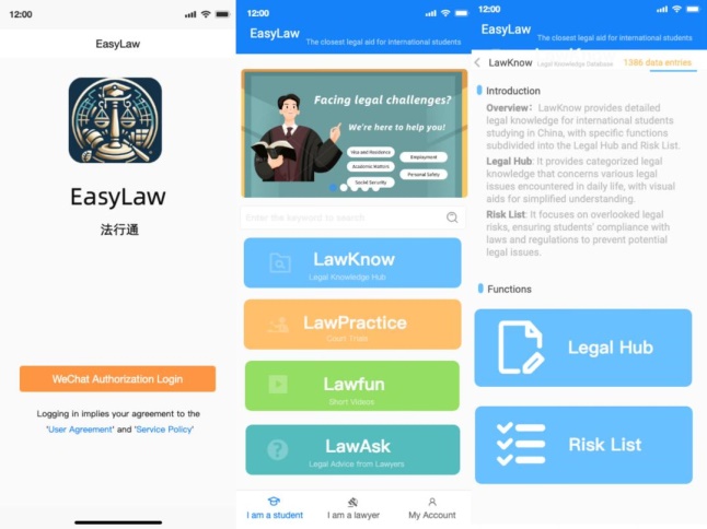 法行通”APPEasyLaw),以服务来华留学生为己任,专注于解决国际留学生在中国遇到的法律难题,涵盖签证、就业、学业、社会保障等问题。该平台提供lawKnow(法律信息小站和风险清单提示)LawFun(寓教于乐的短视频形式)、LawPractice(在线法庭观看服务)、LawAsk(网络法律咨询服务)等四个模块的法律服务,不仅能帮助在华留学生更好地了解并适应中国法律体系,保障自身权益,同时助力中国法律体系走出去,是讲好中国法治故事和促进国际教育的生动诠释。
