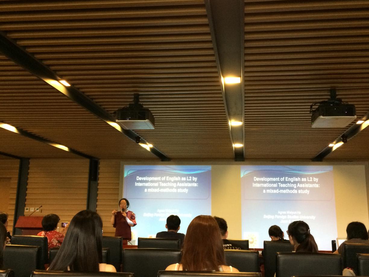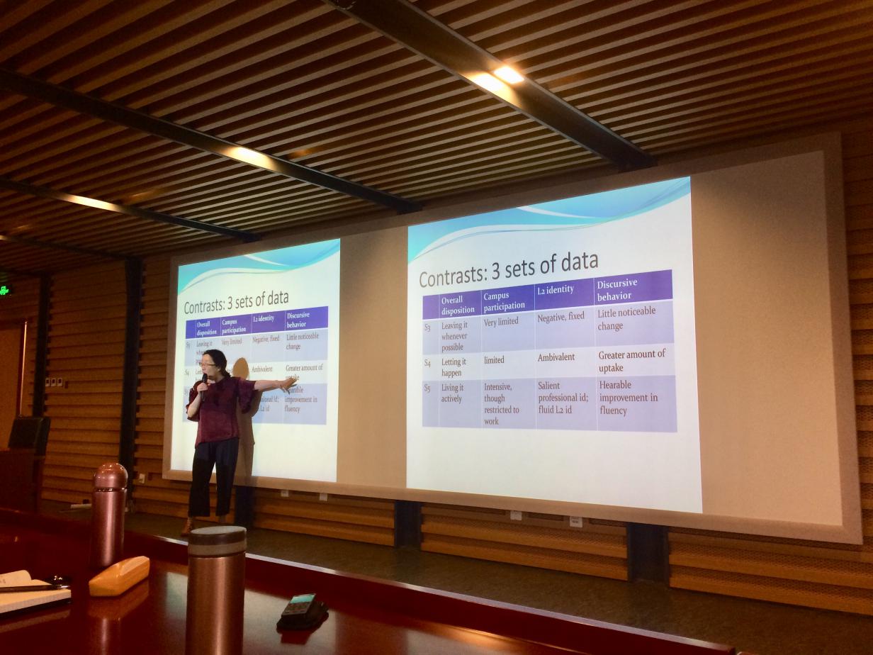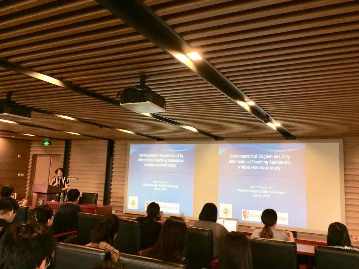 的师生们做了题为“Development of English as L2 by International Teaching Assistants: a Mixed-Methods Study”的学术讲座。何教授是石溪分校多语言和跨文化交流中心(MIC)创始人和中心主任,并且还担任该校亚洲和亚洲美国研究系(AAAS)主任。何纬芸教授主要研究语言语境和语篇的结合,探讨人们如何通过日常互动逐步构建和重构概念、社团和文化。近年来,她专门研究不同时期和不同背景下汉语作为传承语的社会化。