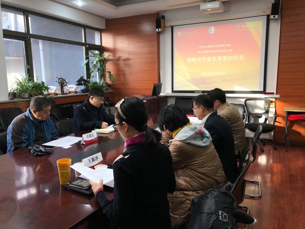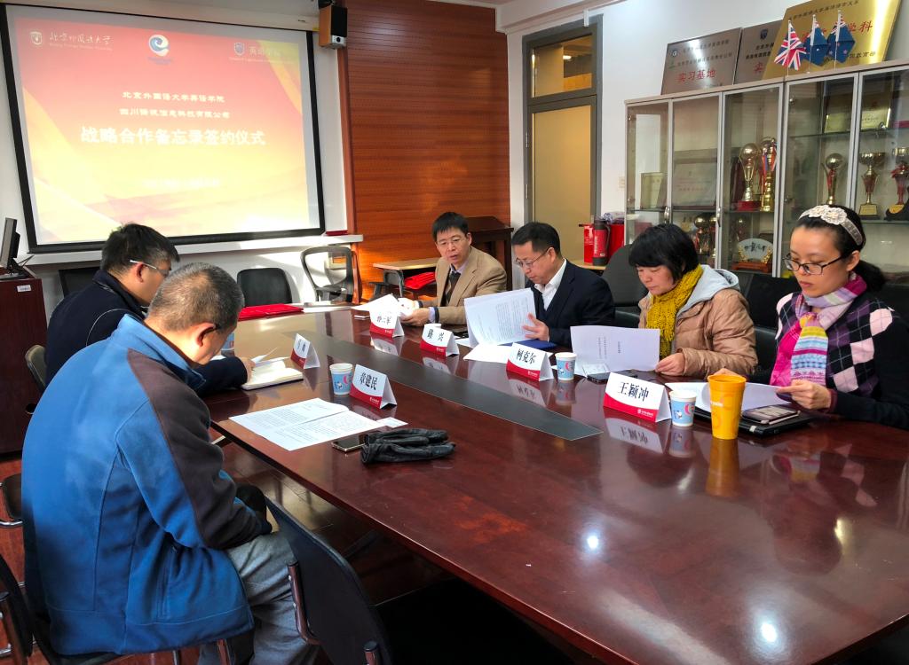会议室举行。党总支书记路兴、MTI翻译中心主任孙三军、翻译系教师柯克尔、王颖冲,译讯科技CEO马帅、副总经理章建民参加。仪式由孙三军主持。