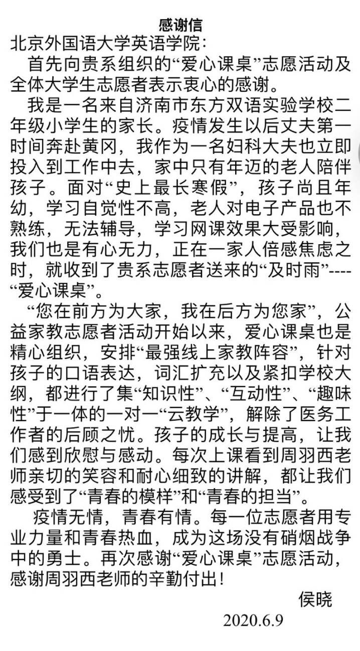 活动期间,无论是志愿者们还是接受辅导的小朋友们都有满满的收获。志愿者们深刻体会到抗疫前线的医务工作者所做出的巨大贡献,并且思考了作为一名教师所肩负的责任,为自己能以实际行动表达对援鄂医务工作者的感谢而深感荣耀。接受辅导的小朋友们或是加深了对足球比分365 的兴趣,或是找到了更高效的学习方法,甚至有小朋友和自己的小老师约定暑假再见,连家长们也说看到孩子的改变十分欣慰,更有家长对志愿者赞不绝口,向足球比分365 发来感谢信表达自己的感受。