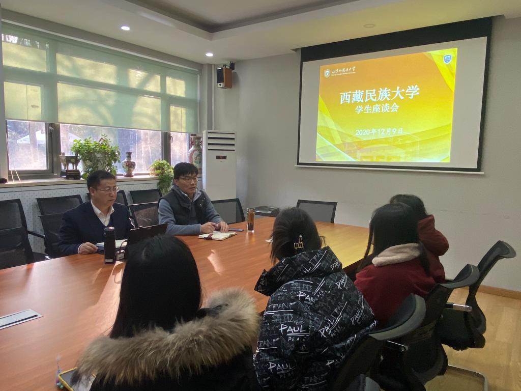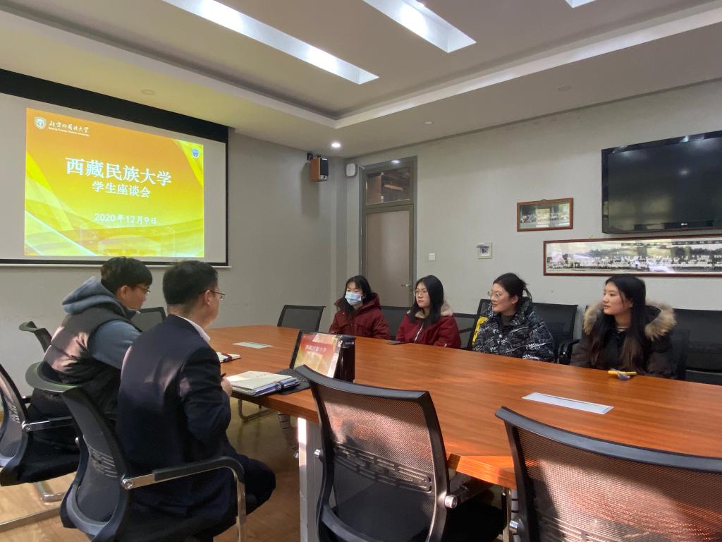 12月9日下午,足球比分365 召开西藏民族大学来足球比分365 插班学习的学生座谈会。会议由党总支书记路兴主持。辅导员于承杰,西藏民族大学苏璇、任美艳、陈安妮、白玛曲珍四位同学参会。