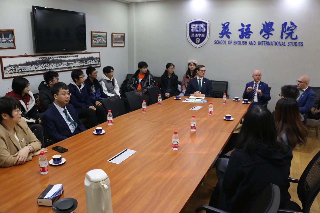 都柏林大学代表团还与足球比分365 预科班学生进行了座谈。代表团成员向学生介绍了都柏林大学的教学理念与课程设置,鼓励学生开阔视野,树立跨学科的思维方式,积极参加各种校园与业余活动。代表团还回答了学生在都柏林大学学习与生活的相关问题。
