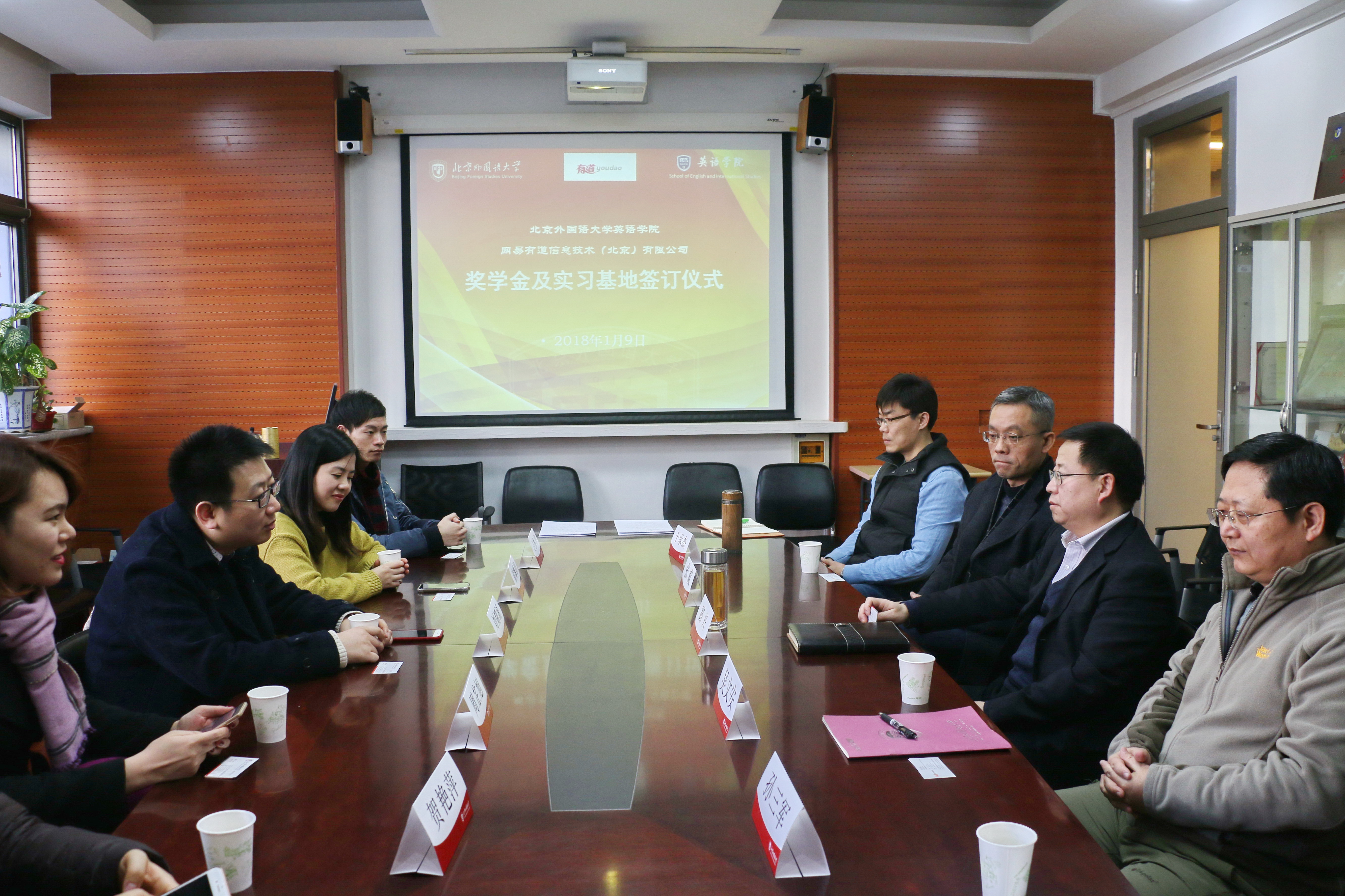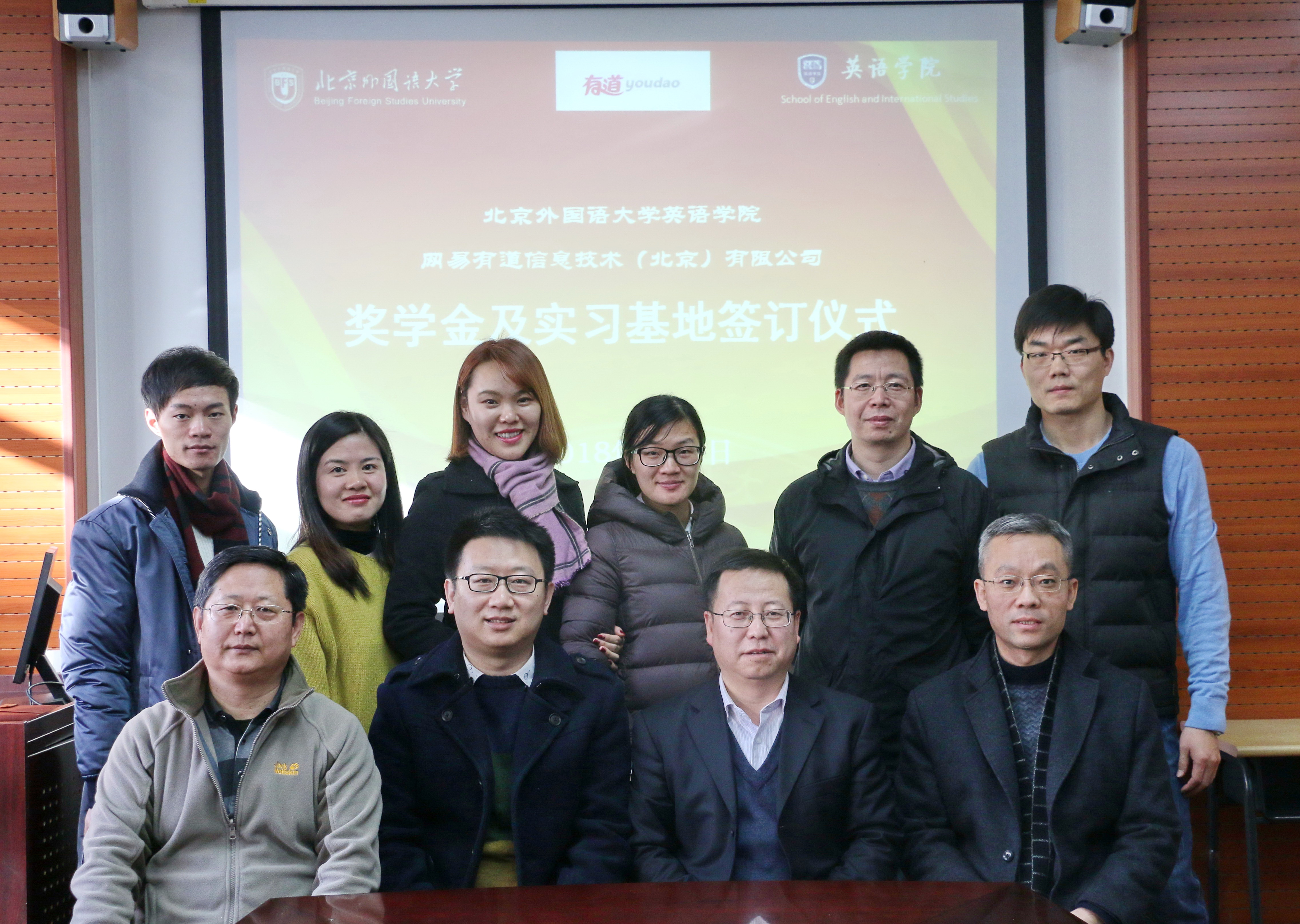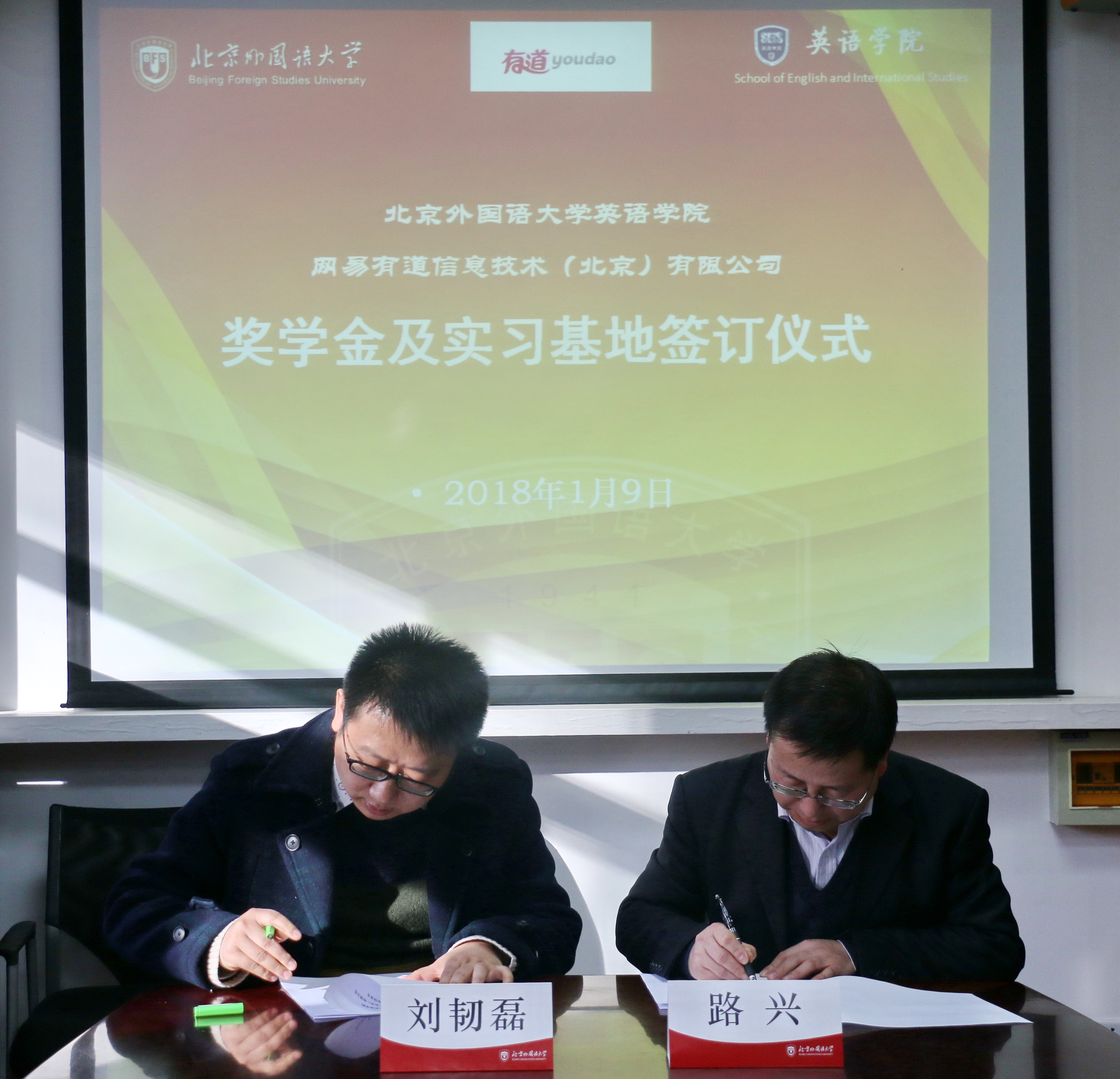 签署“有道翻译奖学金”及北京外国语大学网易有道翻译实践实习基地协议。有道副总裁刘韧磊,人工翻译总经理谢婵娟,教育战略合作总监周芷旭,公关经理贺艳萍,市场经理赵振华出席仪式。足球比分365