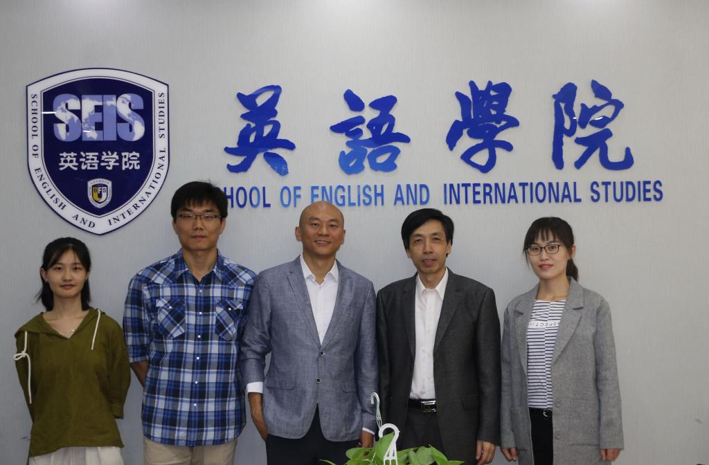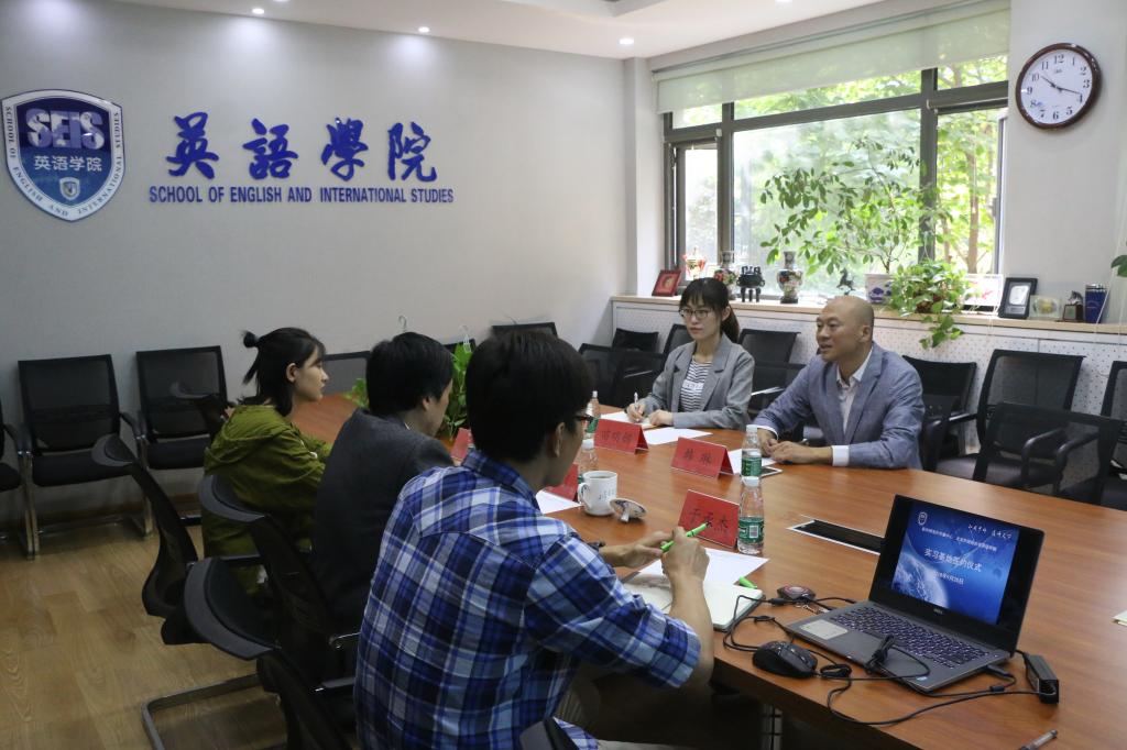 2017届毕业生、现任职新华网海外传播中心英文编辑苗明媚、学生代表参加会谈。