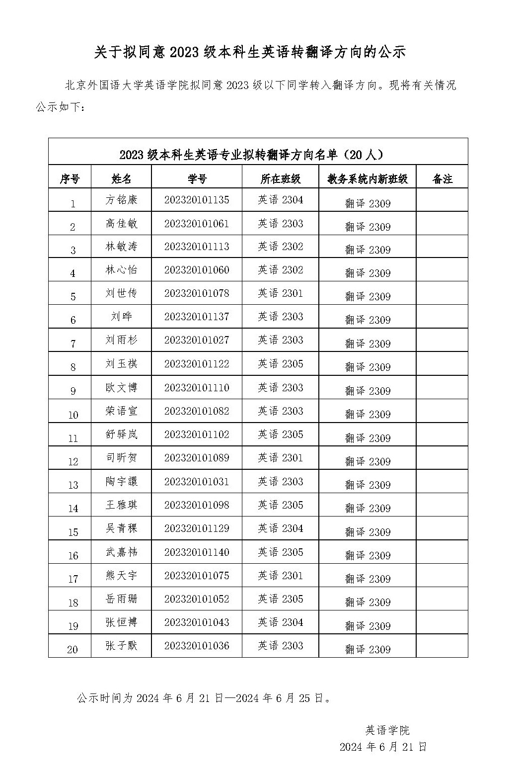 关于拟同意2023级本科生足球比分365 转翻译方向的公示